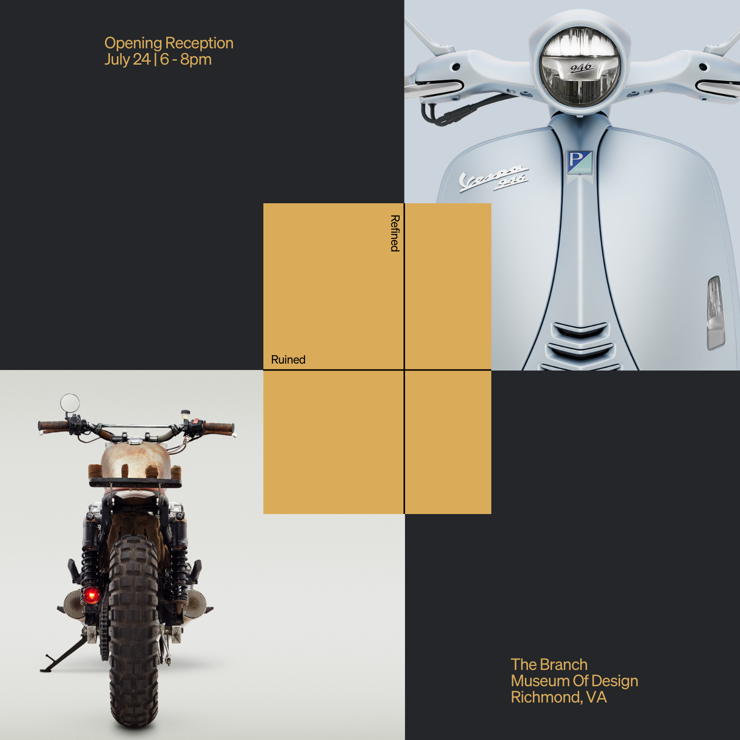 The Branch Museum of Design presents Ruined and Refined—two exhibitions exploring innovation in motorcycle and scooter design—opening Thursday, July 24, 2025.