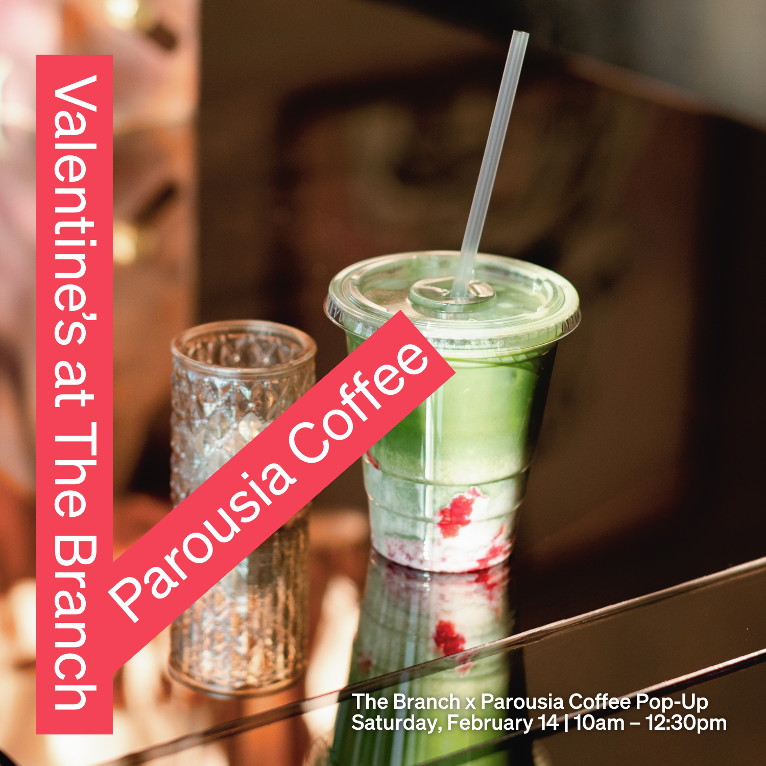 Join us at The Branch on Saturday, February 14 from 10am – 12:30pm for a cozy Valentine’s pop-up with Parousia Coffee. Available for purchase: their new matcha raspberry latte, a special-edition chocolate-covered latte, plus fan-favorite treats like banana bread and coffee cake.